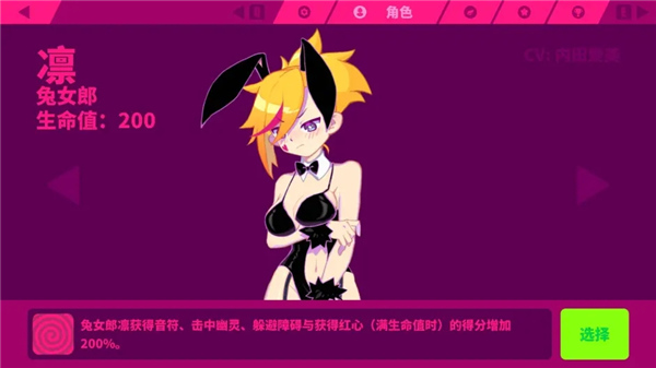那么这两个角色如何去选择,首先把得分项目列出来:小型敌人200;中型300;大型400;突袭300;BOSS远程300;近战500;长按首尾均200;锤子400;双击型600;音符200;幽灵300;齿轮200;红心300(其中后四项是兔女郎的额外加分项目)。