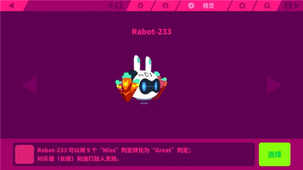 随着歌曲难度慢慢地增加,已经不能全连的玩家来说,以上的两只小精灵已经不适合你了,此时想要高分需要一只新的精灵——Rabot-233