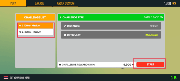 2、有两种路段可以选择100米和200米,选择好后点击“START”开始游戏。