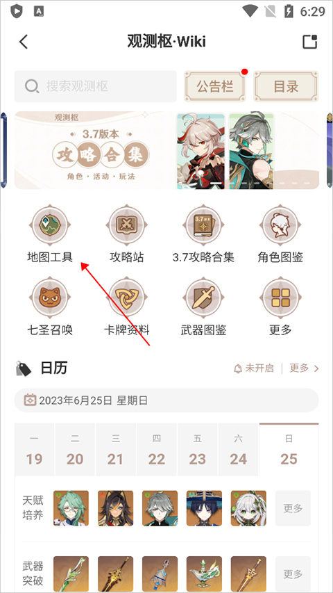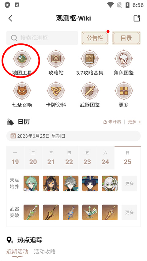 1、用户打开并登录米游社原神区app,进入首页后点击【观测枢】(下图红色方框区域),或者旁边的【大地图】