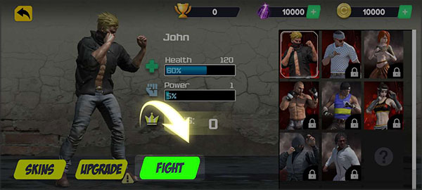 2、选择好角色点击fight开始,角色需要通过游戏金币来进行解锁。