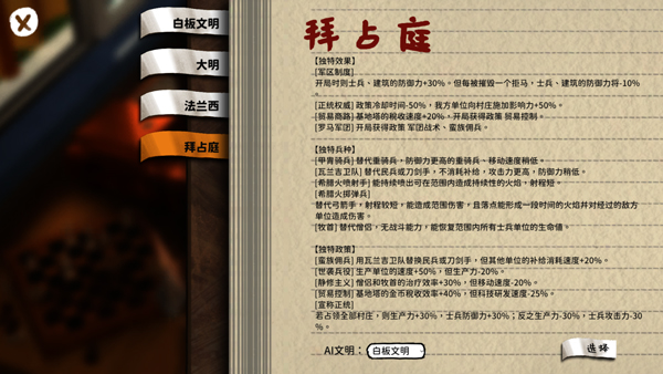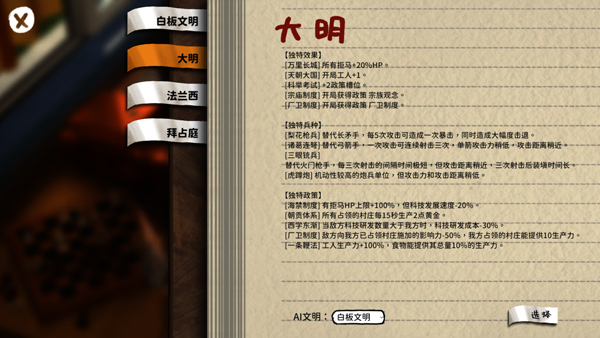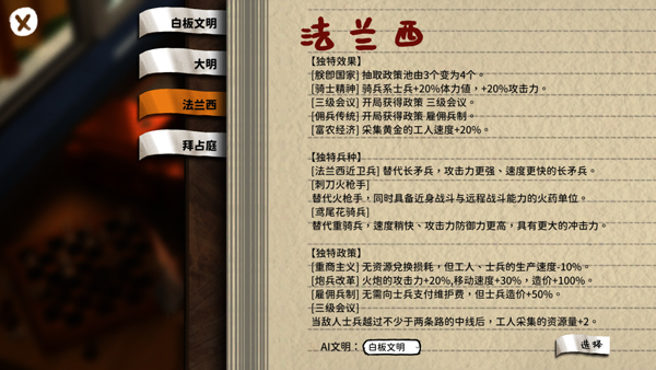 3、接着选择文明,现有白板文明、大明、法兰西、拜占庭四种;