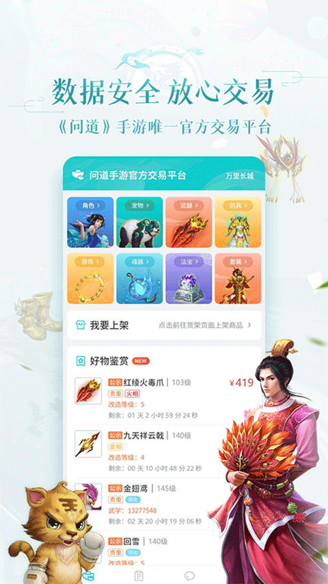 聚宝斋问道手游交易平台是雷霆游戏的官方交易app。该软件主要为问道手游游戏玩家提供角色、宠物、武器、首饰、法宝等物品的交易服务,其服务超过600万玩家,安全成交超1900万笔,且所有交易数据会经过严格的加密和保护,能够确保用户信息和交易数据的安全,大家可以放心使用。