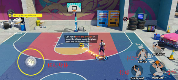 1、打开全明星街球派对网易版,比赛界面内左下角可以移动角色,右下角有传球和投篮等动作。