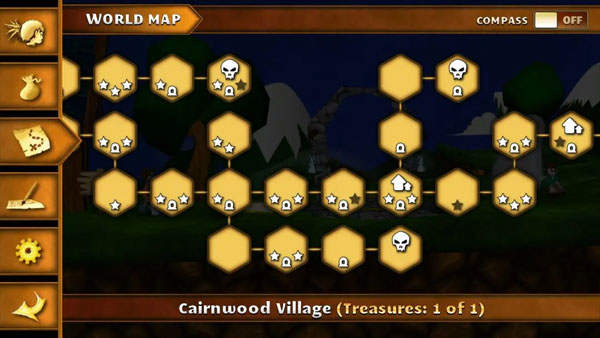 3、这是地图面板,有骷髅标志代表boss战,房屋标志代表有村庄,即旅馆,商店,有拱门标志代表有传送门。星号代表当图宝箱收集进度。