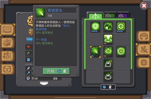技能以被动(加暴击、加流血、提升属性)为主,辅之以少数的远程主动技能(各1级,)。