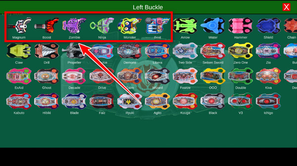 4、先设置左边,用户可以在打开的左边带扣设置页面中就可以选择一种款式了,其中出现的主要骑士带扣排在前面,除此以外还有假面骑士其他系列的联动音效带扣也在其中