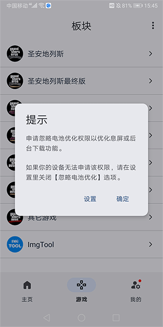 4、由于等下添加完这些模组后为了更好地游戏体验,需要强开手机画质,所以可能会对手机电池有所消耗,所以app会提示你关闭手机的电池优化功能