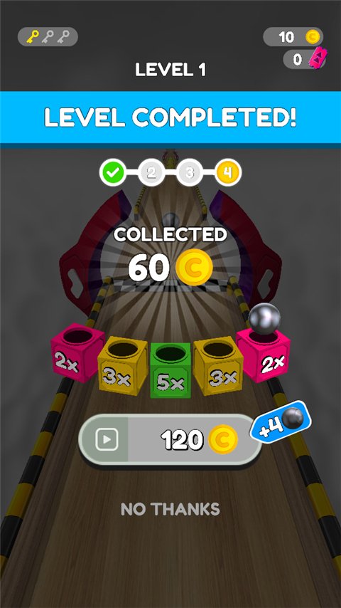 如果快速向前滑动,球的速度就会增加,如果向后滑动,它就会开始减速,玩家的每个手势都需要衡量,这样才能确保自己的保龄球能够在尽可能快的时间内冲过终点线之前不会撞车或跌倒。此外,在保龄球运动的路上,玩家除了要躲避各种障碍外还需要拾取硬币和钥匙,这些道具可以让玩家购买更多的球体换皮肤以及解锁更多的箱子。