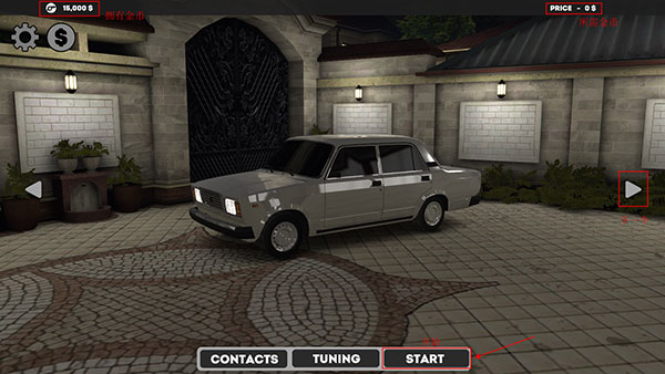 1、来到游戏,看到是一个选车画面,中间是要驾驶的车辆,左上角是玩家拥有的金币,右上角是车辆所需金币,下方的“start”表示开始游戏,中间右边点击可以换其他车辆;