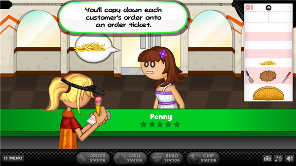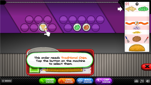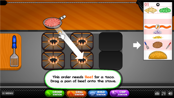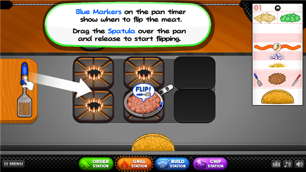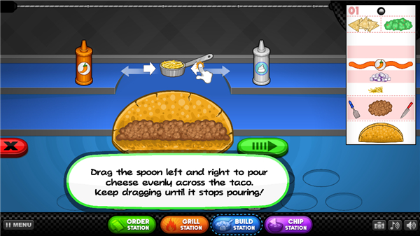 在本作中,每个顾客订单都是一个动手的过程,玩家必须轻松制作各种不同口味的塔可订单,首先玩家需要加入肉锅放到火炉进行烹饪,并继续检查每个锅翻转的正确的时间,当肉丁烹饪完成后倒入卷饼中,然后根据订单口味的需求加入各种配菜,最后在来一碗脆片和新鲜沙拉就能够出餐啦。