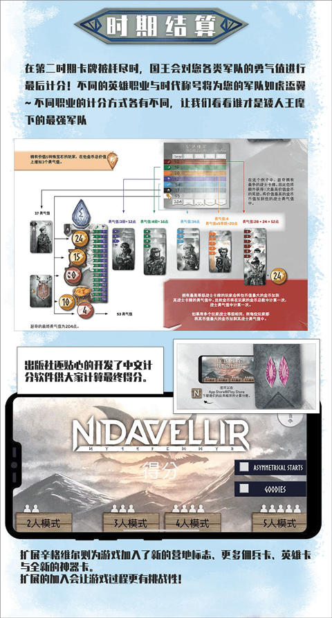 在第二时期卡牌被耗尽时,国王会对您各类军队的勇气值进行最后计分!不同的英雄职业与时代称号将为您的军队如虎添翼,不同职业的计分方式各有不同,让我们看看谁才是矮人王麾下的最强军队。