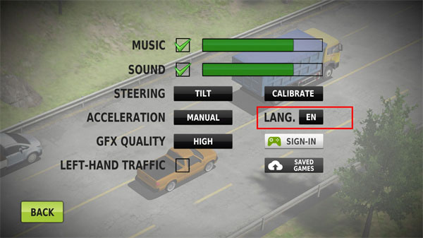 很多小伙伴进入游戏后被重力感应驾驶弄得不知所措,其实移动模式在游戏中是可以设置的。回到游戏最初界面,选择OPTIONS选项,在STEERING中就可以选择TOUCH(左右键移动)或TITL(重力感应移动)。