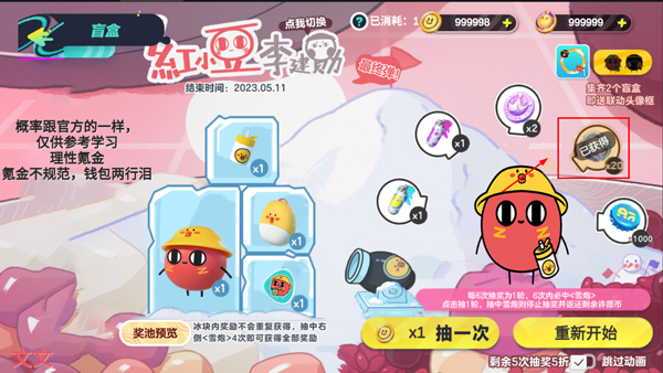 4、当成功抽取到右侧5个物品后即可抽取冰块冻住的红小豆,最多4轮即可抽到;