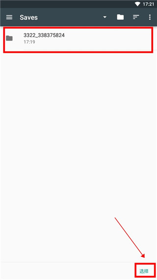 注意:文件查找到这里就可以停止了,在进入【Saves】后就可以点击下方的选择了。这里出现的文件是我们刚才第一个步骤建立的游戏存档,我们不需要进入游戏存档中,进入游戏存档中再点选择是无效的。