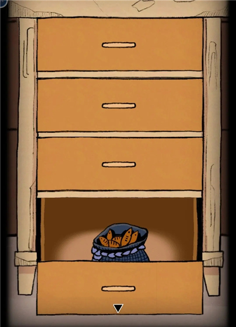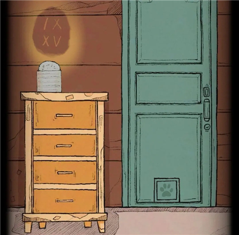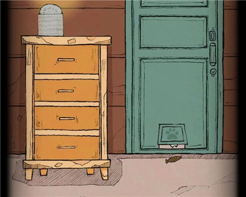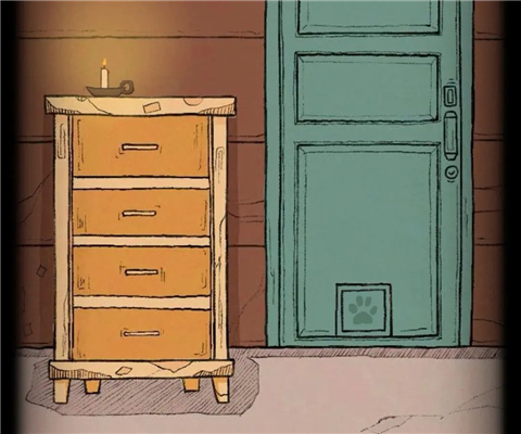 打开烛台下柜子第四格得到小鱼干,将小鱼干放在门下方的小洞口处,会有一只小猫拿走并给到柜子第二格钥匙,打开得到旋钮。
