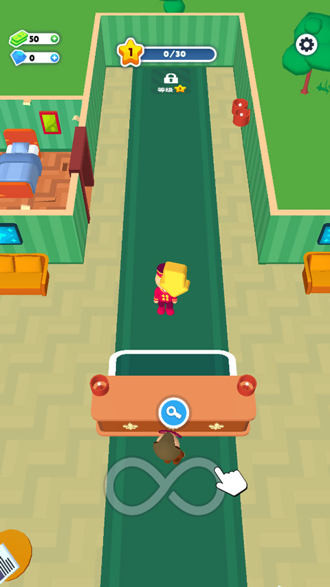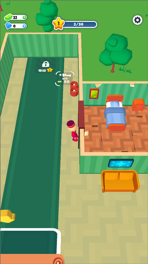 1、玩家打开我的完美酒店游戏,进入游戏玩家的身份首先是一个门卫,玩家需要控制门卫移动到门口把房间钥匙拿给客人;