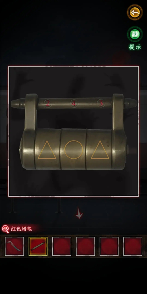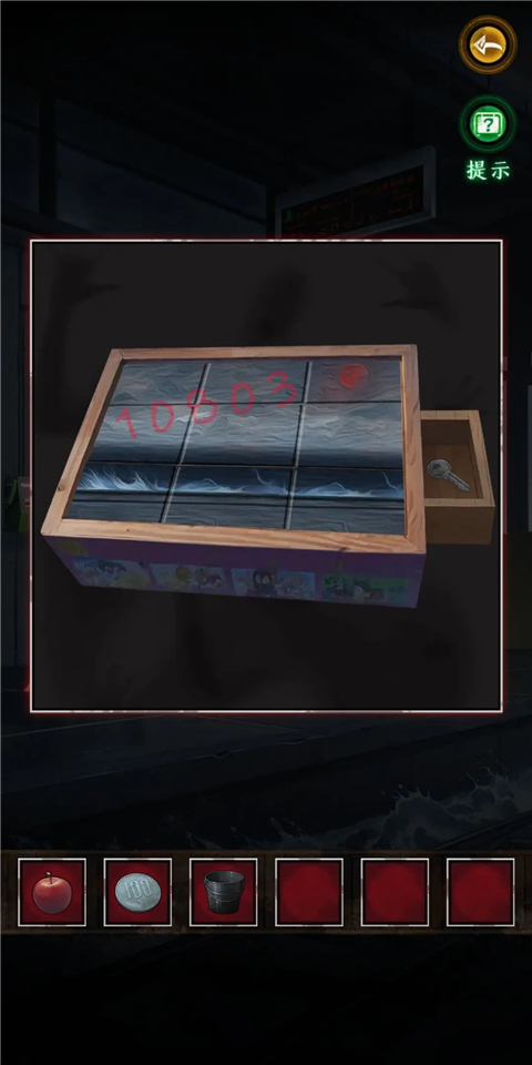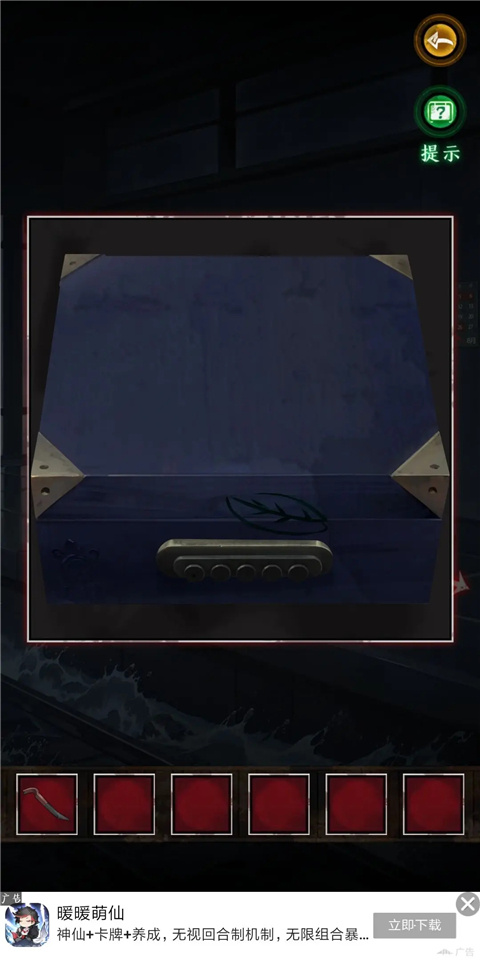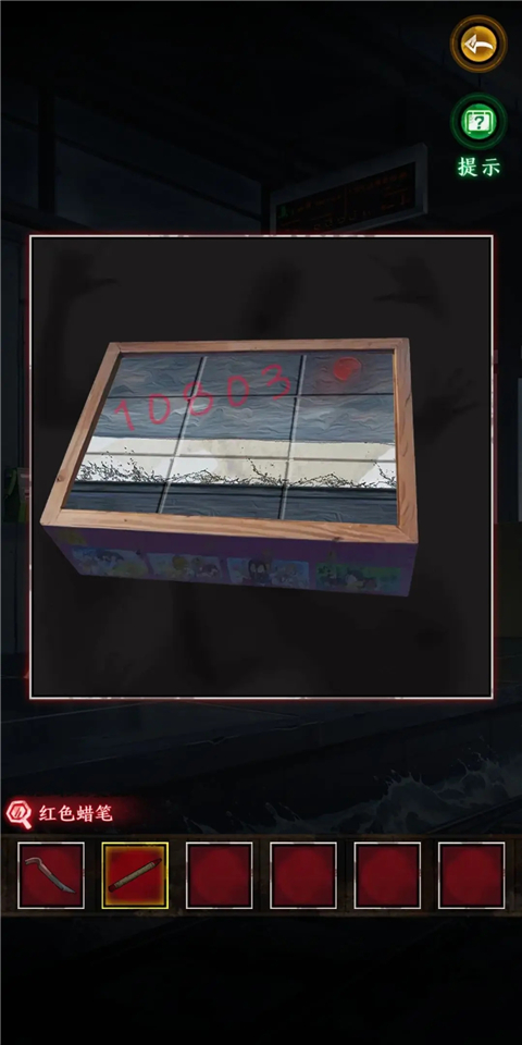 4、根据箱子上叶子的提示,观察叶子动的幅度可以分为微弱,中等,大幅度,简称123,观察后得出密码为12321。得到红蜡笔,拼图碎片和笔记本。