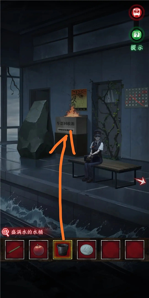 13、继续用空桶去站台装水,得到一桶水,根据笔记本里的记录,对桶使用火柴,然后再使用苹果