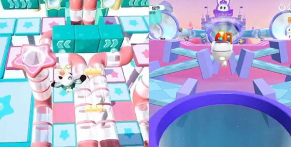 元梦【惊奇探险】是各种障碍元素的堆叠,亮点在于在Y轴上进行了多层赛道的设计,通关路径有种,走上层赛道更快,而从上层掉落后也能继续通过下层赛道。而这个设计,蛋仔好多地图里都有,像是【气球城堡】这张图便很明显,上层跳板可以快速通关,掉下去后也可以通过下层跳板继续攀登。