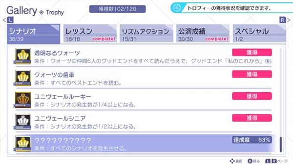 全奖杯最大的阻碍主要有两个,一是全部曲目最高难度SS,不经常玩音游的人很难做到。建议手残的同学选最简单级就好。为了公演奖杯请尽量保证表演结果全优秀。