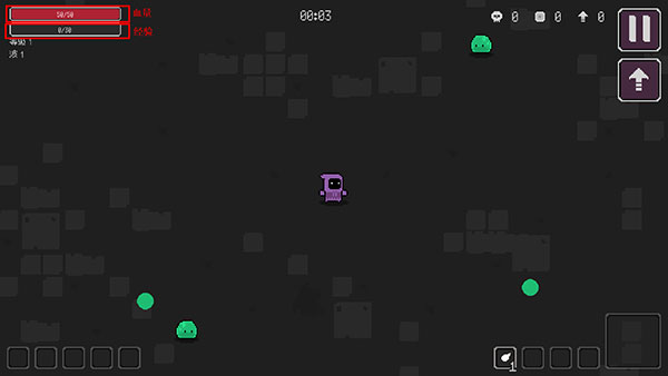 2、左上方是血量和经验显示,下方有等级以及波数;
