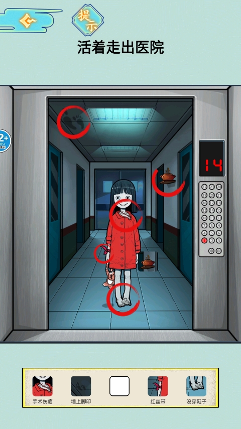 1、打开游戏,进入细思极恐诡异医院,天花板上的脚印,女孩的脚,女孩手里红丝带,女孩脖子的疤痕,病房旁的焚香