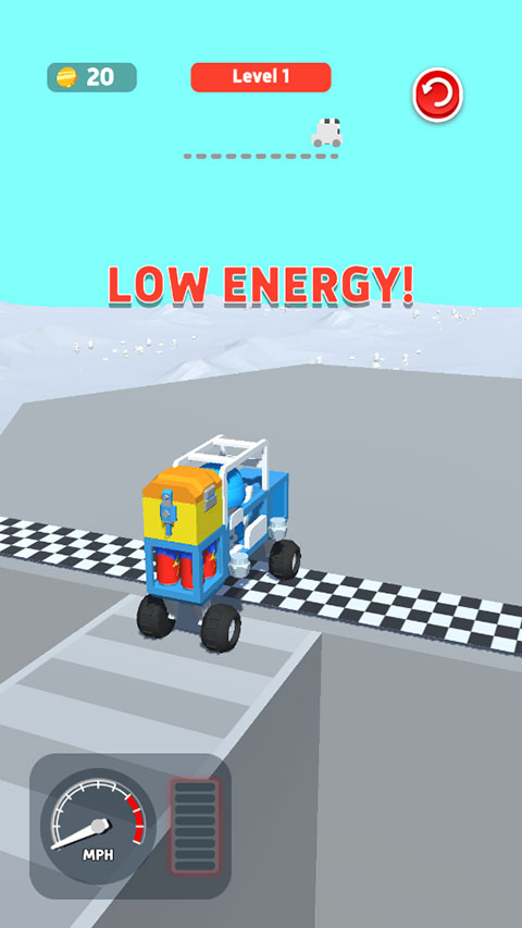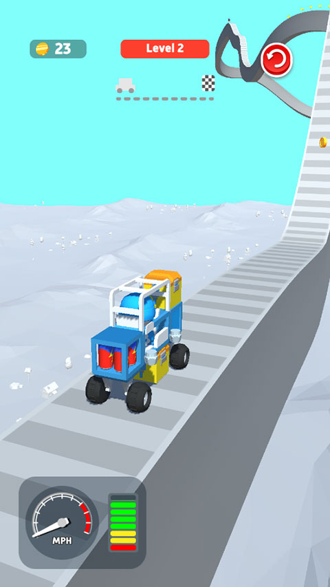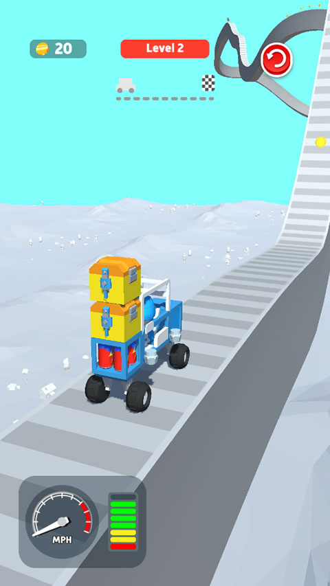 1、玩家可以自己组装车辆完成跑酷,挑战关卡,得到更多的小货车零件。