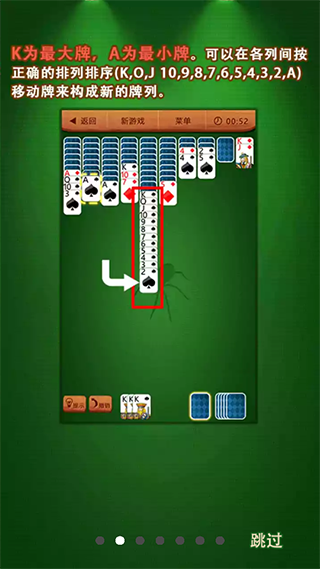 纸牌游戏手机版是一款益智类棋牌手游,可以说是伴随了跟多人成长,它的规则没有改变、界面也没有改变,还是原来的玩法,还是原来的味道,你可以在休闲的时间玩玩,回味回味之前玩这款游戏的感觉。游戏开局只有每叠牌的第一张默认为翻开状态,当移动一叠牌所有已翻开牌到其他地方时,未翻开牌的中最上面的一张将自动翻开,每次发牌的十张牌都为翻开状态,最后玩家需将每一色的A-K连成串即可消去一组。