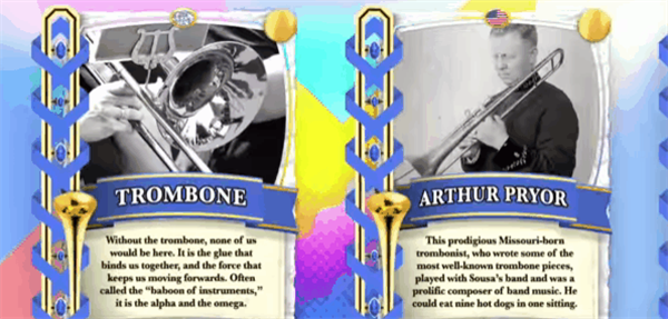 Trombone Champ 拥有超过 20 首曲目,其中包括国歌、进行曲、古典乐曲、电子乐、民间经典等等。该游戏还包括令人兴奋的客座艺术家的曲目。每首曲目都有一个独特的动画背景,随着音乐移动!