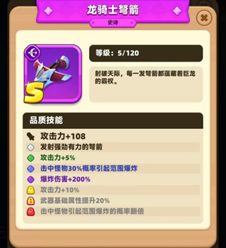 3、至于嘉年华达到750点活跃度后赠送的s级武器龙骑士弩箭,更是堪称现阶段玩家手中的神器,每一发弩箭都蕴藏着巨龙的霸权,非常犀利。能够增加108点攻击力,发射强劲有力的弩箭,提高5%攻击力,击中怪物30%概率引起范围爆炸,爆炸伤害增加200%,攻击力提升10%,武器基础属性提升200%,击中怪物引起范围爆炸的概率翻倍。无论大家想要在游戏中选择哪些能力,龙骑士弩箭都可以大幅度提高输出能力,让闯关变得更简单。
