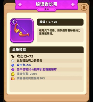 2、其中秘语者长弓还可以通过合成的手段来获得,所以是玩家上手最为简单的史诗级武器。它能够增加72点攻击力,发射强有力的箭矢,提升5%攻击力,击中怪物后30%几率引起范围爆炸,以及爆炸伤害增加200%,武器基础属性提升20%等,有了这些属性加成,玩家的实力就能大大提升。
