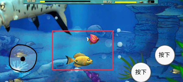 3、通过触屏操控小鱼移动,过程中碰到比自己小的鱼即可吃掉对方。