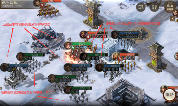 使用召唤物承担抗伤坦克和输出武将的作用,利用人数多过敌方的优点组合成为一套集防御、输出、辅助于一体的战斗体系。
