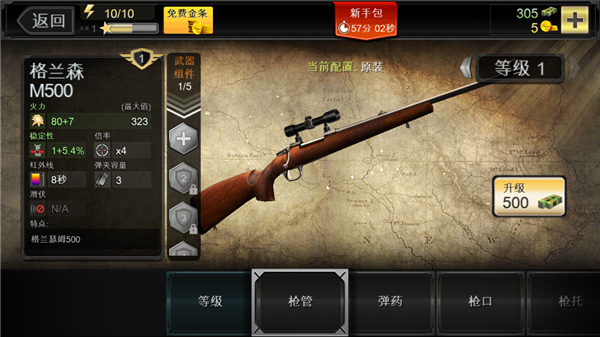 3、你可以给任何枪支升级,升级项目有枪管、枪口、枪托、瞄准镜、红外线、弹夹容量、弹药等等。给不同部位升级,性能提升的倾向也有不同。一把武器的好坏,是根据火力(杀伤力),稳定性(准心漂移区间变小),最大变焦(放大的倍率)、红外线(时间),弹夹(子弹容量)来决定的。一般来说优先升级火力和稳定性。升级需要效果金钱或者金条。升级等级越高,需要的金钱数也越多。