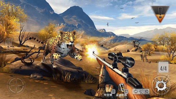 6、先打距离最近的,这样威力大,瞄的准。点击左边的准星键,切换到望远镜模式,在望远镜模式下,可以通过触摸操作来放大倍率,最大倍率为4倍。然后选择红外线拍摄,即可看到猎物的肺部,瞄准肺部射出子弹。选择交换可以切换武器。