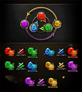 所有属性都带有相生相克的关系,不论属于自然的水、火、木属性,还是属于神魔的光、暗属性也不例外。善用「属性相克」的设定可针对性降低关卡攻略的难度。