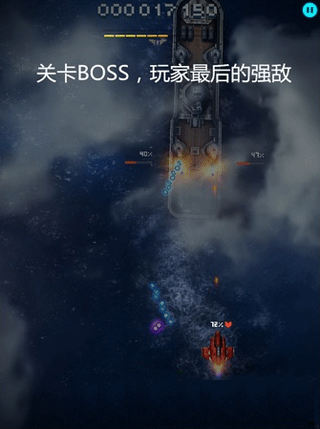 每个关卡最后都会有一个超强大的BOSS,第一关是一艘很大的战舰,玩家需要将战舰上的所有炮都摧毁即可将战舰打败过关。