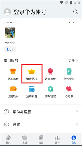 2、进入游戏中心之中点击菜单之中我的选项,然后选择消费特权选项。