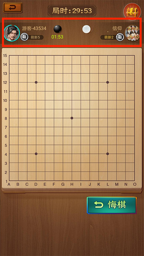 2、进入【对局界面】,对局时间为30分钟,左上方为自己,右上方为对手,按照黑棋先下的原则,开始落子,