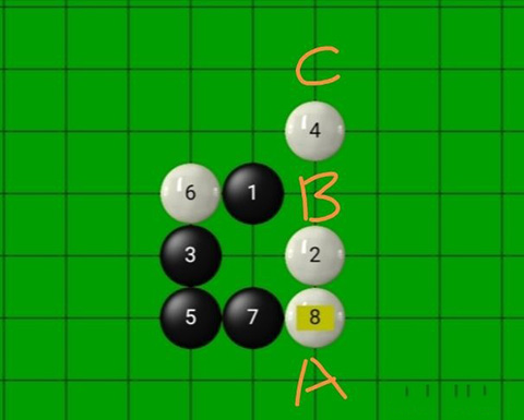 黑9可以落在ABC三处,但最优点是落在A,这样既防也攻。落BC的话黑棋的优势可能就没有了。