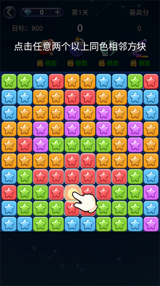 玩法也非常简单,只需要消除相邻的2个或以上的同色星星即可完成消除。游戏没有时间限制,一次消除的星星越多可获得高分,只要达到目标分数即可完成通关,你会获得多少分呢?是否会破纪录呢?还在等什么?快点下载玩起来吧!