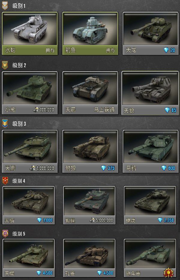 玩家的初始入门是水蛇坦克,不需要过多培养。因为我们要快速攒钱到20000军费购买箭鱼坦克,优点是行驶速度快和开火速度快,灵活性高,用箭鱼坦克在战场中多拾军费,将它升至满级一直可以用到中期,所以这里不推荐用20钻石买天龙坦克。