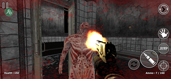 3、在游戏中玩家将利用手中的武器去击杀僵尸,左边屏幕控制移动,右边为换弹、射击、跳跃、瞄准按键
