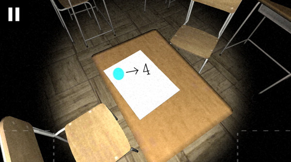 2、转回来,可以看到课桌上有一个提示。兰色圆形→4。暂时不知道有什么用。先记录下来吧。