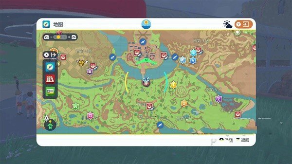 按下Y键可以打开地图,ZL和ZR键可以对地图进行缩放。转动右摇杆可以旋转地图,按下右摇杆可以将地图方向重置。地图中带有白色的叹号的黄色图标为主线目标所在位置。精灵球图标宝可梦中心的位置,已经到访过的宝可梦中心会带有白色翅膀标记,在地图上选中后按下A键可以快速传送至该宝可梦中心。