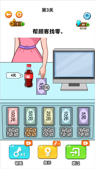 2、同样的方法,只不过这些的商品从口香糖的5块钱变为了冰棍3块钱,将左边的1元钢镚提交两个给顾客。