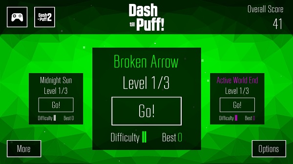 几何逃生1最新版是一款锻炼玩家反应力的休闲类小游戏,英文名叫Dash till Puff,在这里玩家只需控制圆球飞行,从杂乱的计划图块中穿行。简约的风格设计,搭配炫酷的背景,游戏内场景会不断的出现渐变,颜色的变换,可有效防止眼睛过度疲劳。然而,虽是一款简单的小游戏,通关难度却一点不低,这需要玩家们勤加练习,才有一丝通关的可能。