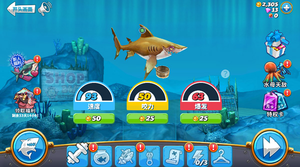 3、寻找宝物取得金币与宝石,用来升级你的鲨鱼或者购买特殊救生道具;