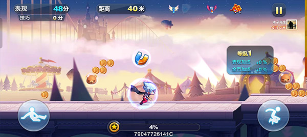 3、雷霆领主通过不断的吃飞星来点亮翅膀,获得更多的表现加成。同时雷霆领主还拥有300%的飞星得分加成,120%的冲刺得分加成属性。在冲刺技能结束之后,还会有闪电出现,将前方金币变成高分闪电球。所以雷霆领主比较适合搭配冲刺类型的角色,利用技能释放来获得比较高的分数。